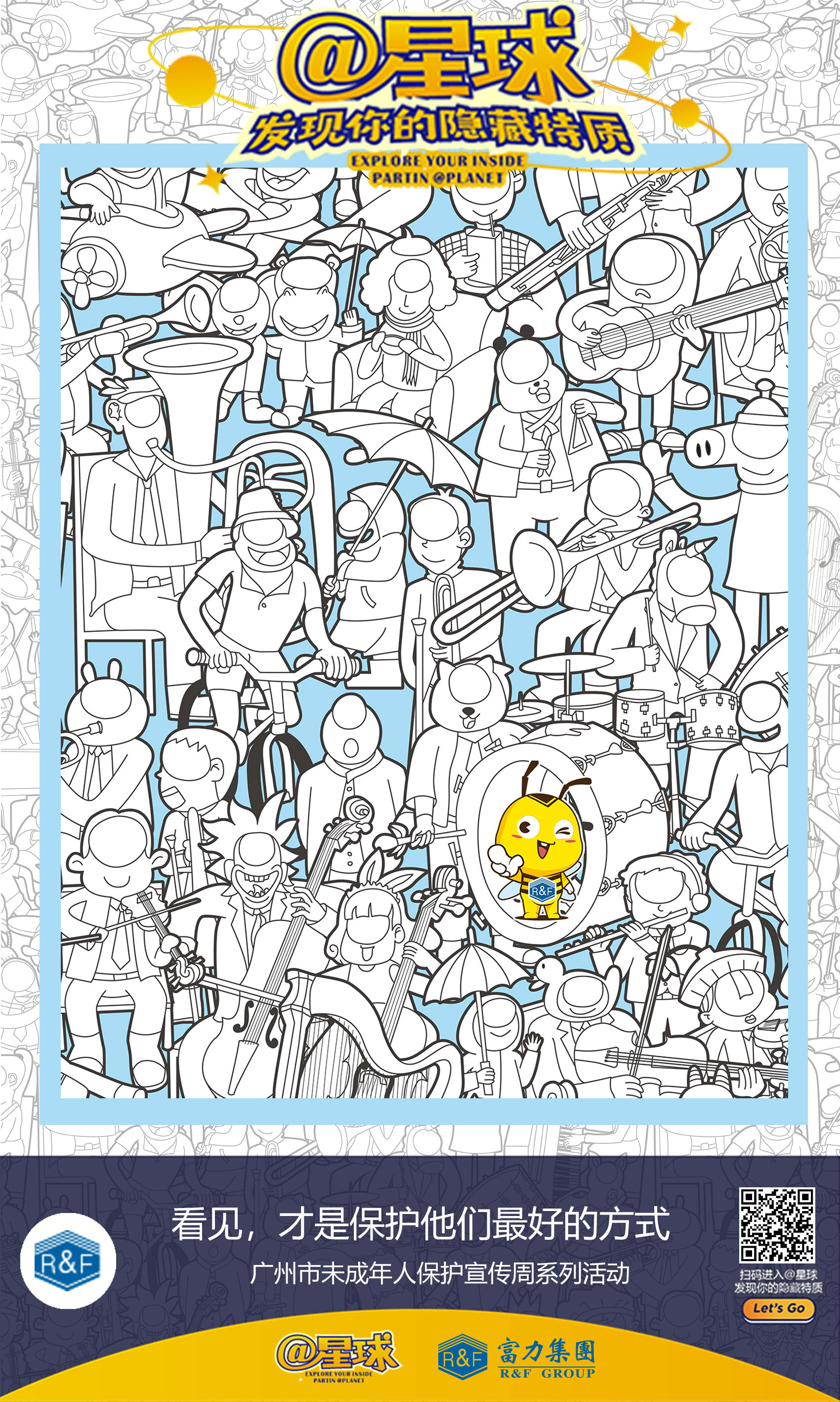 在這個(gè)發(fā)現(xiàn)自我隱藏特質(zhì)的互動(dòng)H5“@星球”中,玩家通過選擇喜歡的圖案、擦出色彩,就可以發(fā)現(xiàn)自己的一種隱藏特質(zhì)。“@星球中一個(gè)個(gè)鮮活的卡通形象展示不同的人群,每個(gè)人都可以在@星球中找到自己‘合眼緣’的一個(gè)甚至多個(gè)角色”。大家還可以在畫作中找到屬于富力集團(tuán)的富力人“富小蜂”,為它也涂上獨(dú)特的色彩吧。