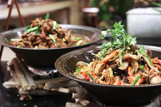 干鍋香辣魷魚(yú)&蝦,干鍋肥腸配臘腸&茶樹(shù)菇,干鍋雞雜